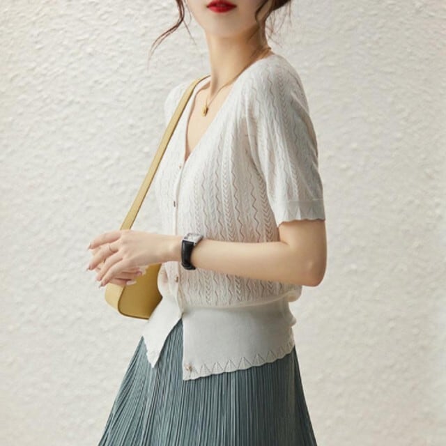 清涼感のある着心地: 通気性に優れた軽いニット素材を使用。真夏の外出時や、冷房対策の羽织りとしても重宝する万能な一着です。
